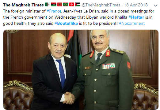 Alžirski general i predsjednik je podržavao libijskog jakog čovjeka i generala Haftara, također antiislamiste, liderom donedavno trećine zemlje. Sada je Haftar u prodoru pred vratima Tripolija, i kontrolira oko 75% teritorija.